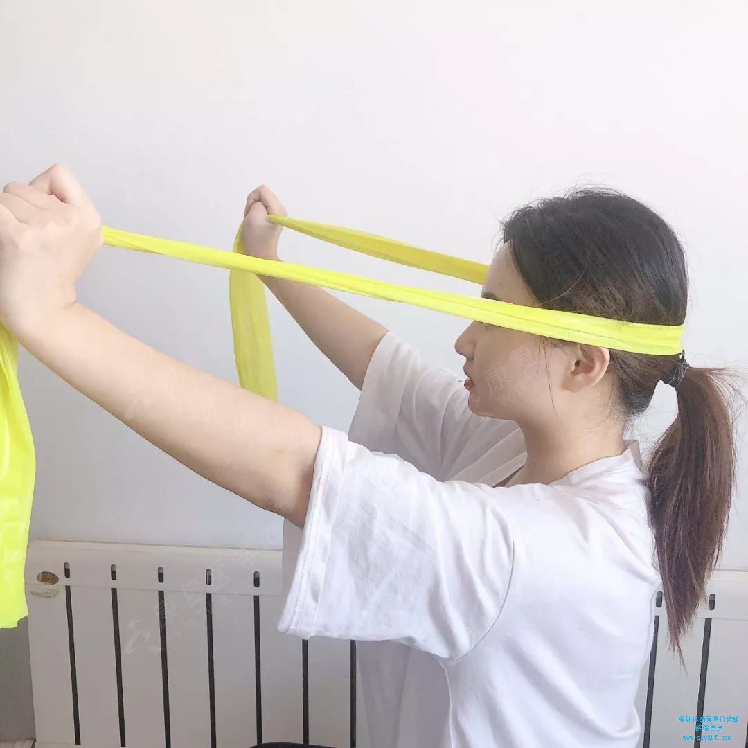肩关节活动训练:手心向下握住弹力带,肘关节微屈,两臂上举,将弹力带环绕至身体后方,略作停顿,再将弹力带环绕至胸前,动作过程注意匀速柔和,不要用力过大。