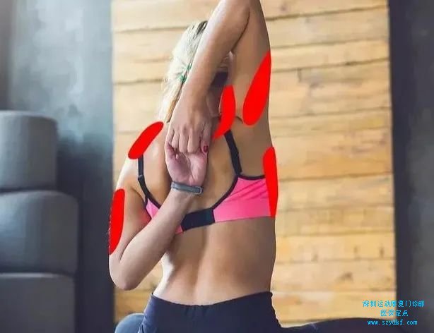 拉伸肩部、手臂的内外侧:坐姿腰部挺直,如图曲手肘放在上背部左手向下向后,曲手肘双手互拉如果拉不上,可以借助伸展带。